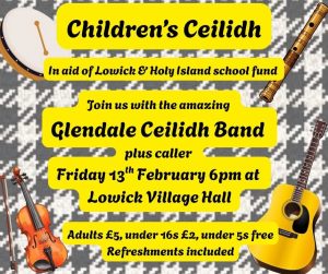 Children’s Ceilidh with the Glendale Community Ceilidh Band, in aid of Lowick and Holy Island Primary Schools. Tickets on the door £5.